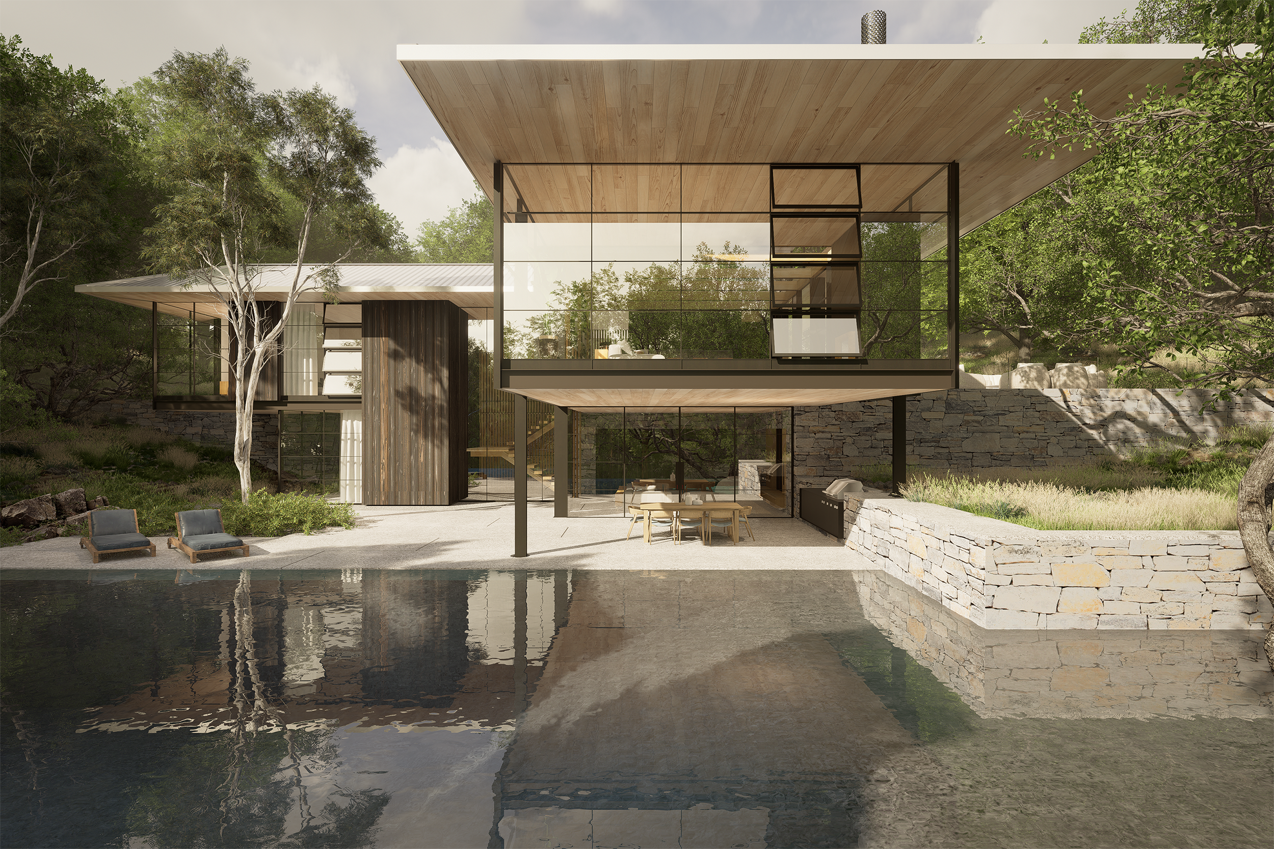Nestled in a rugged, wooded valley just outside Austin, this home is designed to embrace its untamed natural surroundings. Oriented to capture sweeping views into the Hill Country, the residence balances a traditional gabled form with refined modern detailing. Durable, low-maintenance materials such as standing seam metal roofing, steel-framed windows and doors, and natural wood and stone anchor the home in its environment while optimizing for longevity. The home settles into the landscape with quiet strength, offering a refined expression of permanence and place.